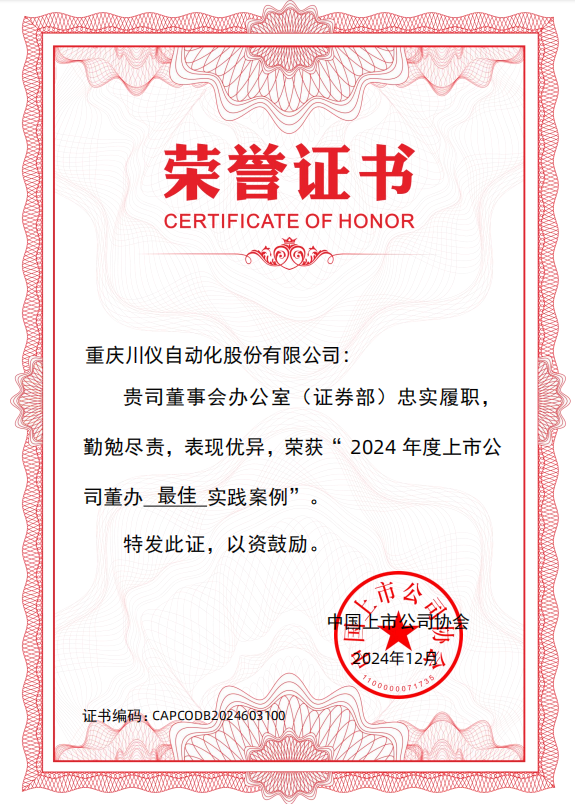 入选“2024董办最佳实践案例”的280家上市公司中,沪市上市公司175家。连续三年入选,体现了中国上市公司协会对在信息披露、投资者关系管理、公司治理等方面的高度认可。